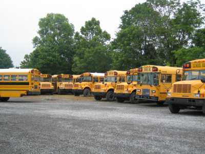 Omdat het inmiddels vakantie is, staan alle schoolbussen op de parkeerplaats
