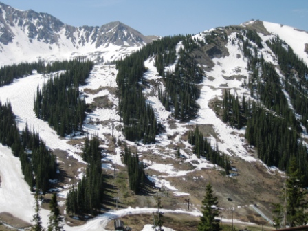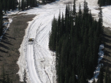 hellingen van de Rocky Mountains: sneeuw wordt eind juni geprepareerd