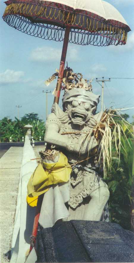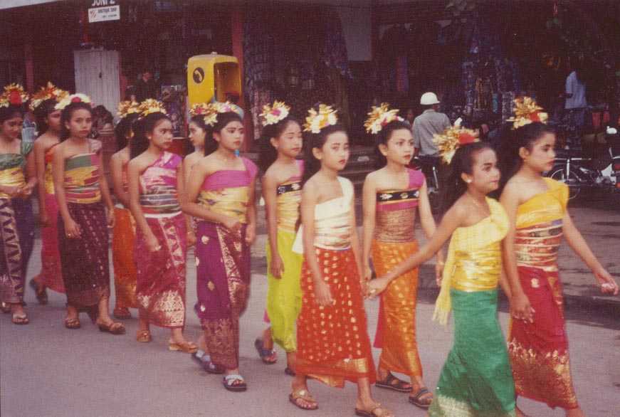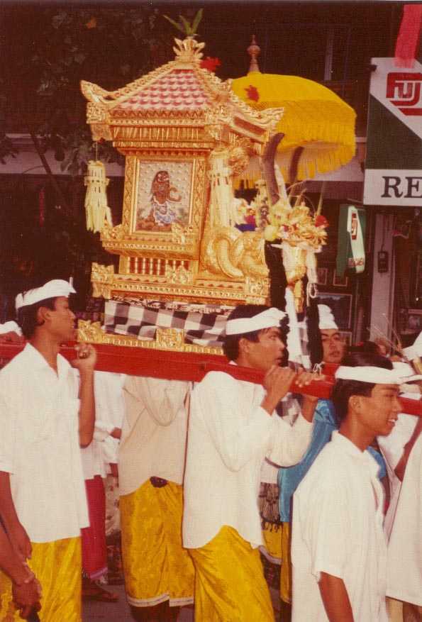 Hari Ribu 8 juni Tijdens het ontbijt maken we kennis met Mr. Oka, de eigenaar van het bungalowcomplex. Hij heeft uitgebreide verhalen over vroeger. Hij spreekt nog perfect Nederlands. Wij vinden het een echte aristocraat. Veel later dan gepland, maar wat is planning in dit land, gaan we naar de ochtendmarkt. Hier kopen we, na zéér hard onderhandelen, (28.000 i.p.v. 50.000 Rp) twee tafellakens en 6 servetten. Vervolgens gaan we naar de groente-, fruit-, vlees-, vis- en wat-al-wat-niet-meer markt. Het stinkt er geweldig en veel spullen zien er erg onhygiënisch uit; overal zitten beestjes op en in. Om half 12 gaan we richting restaurant Wayan voor een kop koffie met wat lekkers erbij; uiteindelijk lunchen we daar ook. Aansluitend gaan we op pad voor een wandeling naar Nyukuning met rijstvelden. Na enig zoeken vinden we het juiste pad. Een leuke wandeling! Het dorp zelf is ook heel leuk. Via Monkey Forest lopen we naar "huis" terug. Vervolgens pakken we de fiets en gaan naar Petulu. Hier overnachten duizenden witte reigers. 's Morgens verlaten ze het dorp en ’s middags tegen 5 uur komen ze terug. Een prachtig gezicht al die bomen vol witte vogels. Op de weg terug stuiten we op één of andere processie. Het blijkt een terugkerend ritueel te zijn. Om de 30 weken gaat men, gekleed in traditionele kleding, langs 3 kleinere tempels waar mensen worden opgehaald, om tenslotte samen naar een grote tempel te gaan om offers te brengen.