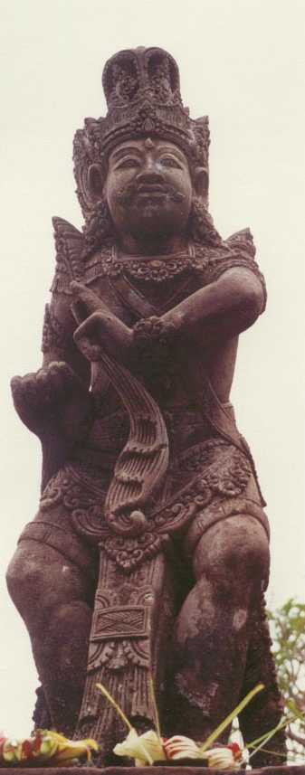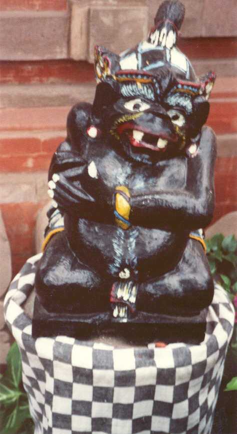 Hari Selasa 7 juni Tijdens het ontbijt begint het te regenen!!! Gelukkig klaart het al snel weer helemaal op. Om half 9 gaan we op pad voor onze eerste etappe. Tot Mengwi zijn de wegen verschrikkelijk druk. Dat valt ons bar tegen. Daarna wordt het wel wat beter, maar echt rustig wordt het nog niet. De omgeving is echter schitterend en ik maak hier voor het eerst kennis met de rijstvelden en ben sprakeloos. Ik realiseer me op dat moment pas echt goed dat ik daadwerkelijk in de tropen ben, en dat een (letterlijke) jongensdroom in vervulling is gegaan. Een moment om nooit te vergeten! De hele rit moeten we "Hello" roepen, iedereen zegt ons gedag. Om 1 uur zijn we in Ubud, het einddoel van deze eerste etappe. We hebben een adresje, dat we van vrienden hebben gekregen, opgezocht en gevonden. Het ligt pal aan de hoofdweg en er raast heel wat verkeer overheen, maar de bungalowtjes zelf liggen achter een muur en zodra je daar achter bent hoor je het verkeer nauwelijks meer. Kort na onze aankomst horen we tromgeroffel, wij erop af! Het blijkt de repetitie van een gamelanorkest te zijn. Leuk om mee te maken. Bij Café Lotus gebruiken we een lichte lunch. Café Lotus is een schitterend complex met een oude tempel en een prachtige vijver met lotusbloemen. Na de lunch gaan we naar Monkey Forest. Hier schijnen nog zo'n 500 apen te zitten. Omdat we er aan het eind van de middag zijn, hebben ze zich al aardig volgevreten en zijn daarom ook minder agressief dan ze soms schijnen te zijn. Ze zijn dan ook vrij natuurlijk bezig: in bomen aan het springen en spelen. De brutaaltjes zijn nog wel erg toeristisch en ik krijg het nog aan de stok met één van hen. Op de terugweg lopen we Paul en Jacqueline weer tegen het lijf. We eten samen in Wayan Restaurant. Een prachtig restaurant, heel sfeervol, met een prachtige tropische tuin. ’s Avonds gaan we naar een voorstelling van Balinese dansen. Heel gracieus. Iemand vertelt het verhaal en de dansers beelden het uit, begeleid door een orkestje van met name slagwerk.