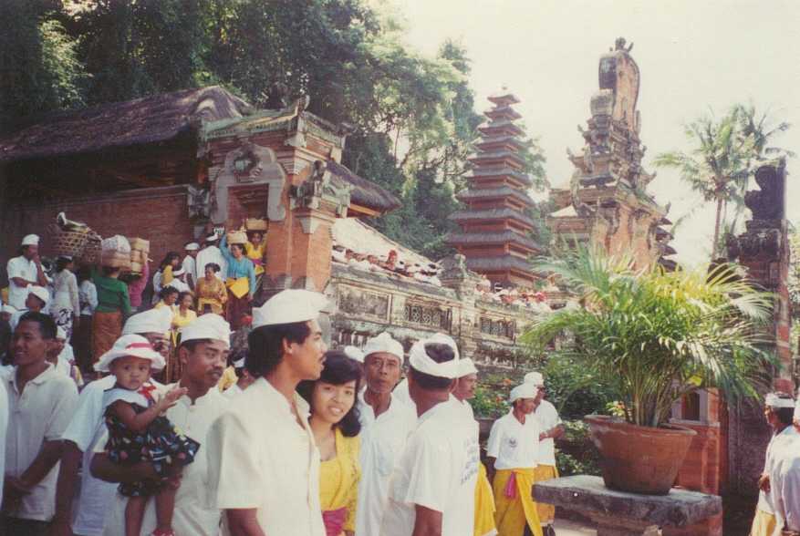 Bij "Bat Cave", de tempel Pura Goa (Goa Lawa), stoppen we. Er blijkt een grootse ceremonie aan de gang te zijn. Hier gingen dus al die vrachtwagens volgepakt met mensen naar toe! Processie naar de Pura Goa