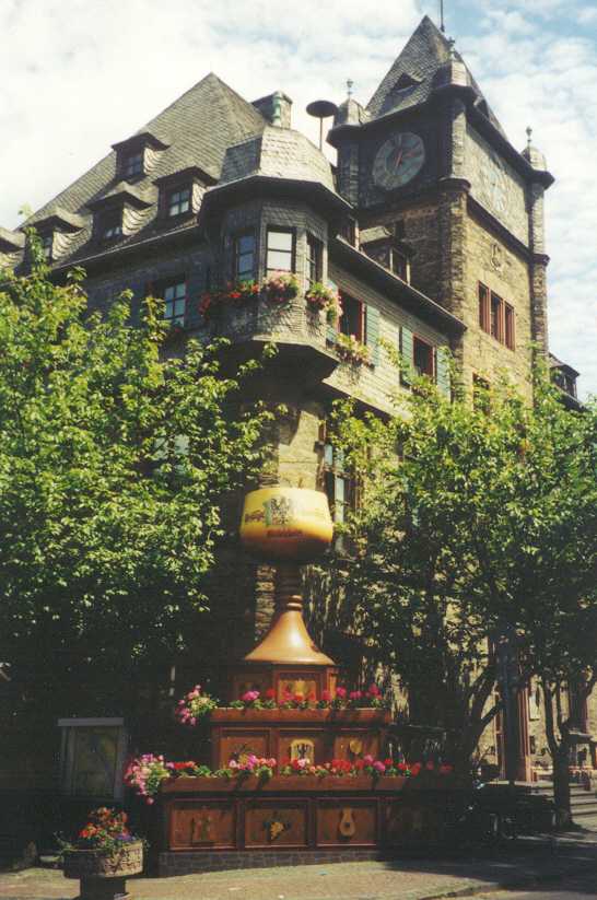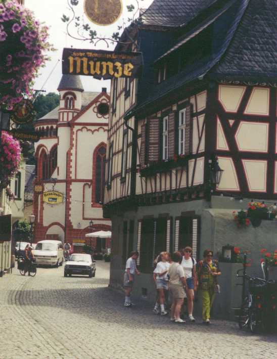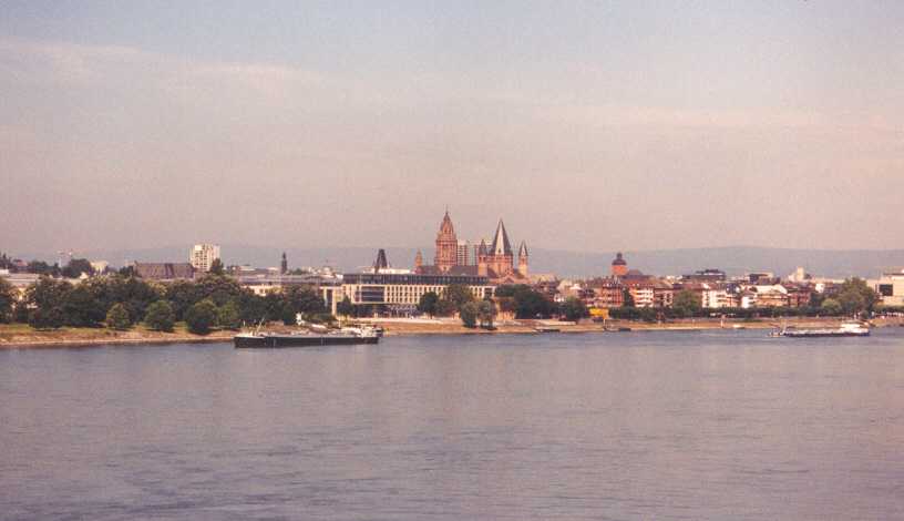 We wisten uit het routeboekje dat we op een niet al te rustige camping stonden, maar dat het zo’n herrie zou zijn hadden we niet verwacht. De hele nacht reden er treinen met een vreselijke herrie aan de overkant van de Rijn af en aan, terwijl de vrachtauto's over de weg langs onze tent raasden. Verschrikkelijk. Oordoppen in dus. Na deze hopeloze nacht de volgende dag weer om half 10 op de fiets. De tocht voert ons vrijwel de hele dag langs de Rijn: Koblenz, Boppard (koffiestop) en via Bad Salzig naar St. Goar, waar de Loreley rots staat. Bekend van de sage, waarin een schipper, afgeleid door een schone maagd met verlokkend gezang, op de rotsen loopt. Vervolgens door Bacharach (een schitterende plaats met zeer mooie oude vakwerkhuizen) en Bingen naar de camping in Heidenfahrt. De camping stelt niet veel voor, bijna alleen maar stacaravans, maar is wel mooi gelegen (inderdaad aan de Rijn!) en zeer rustig. Na ons geïnstalleerd en gedoucht te hebben zijn we bij het restaurant vlakbij de camping gaan eten. Lekker buiten in de zon! Het weer is fantastisch. Elke dag volop zon en niet te heet, tussen de 20 en 25 °C, heerlijk! Donderdag 25 juni (Heidenfahrt - Lorsch, 90 km) Vanaf Bingen zullen we niet meer langs de Rijn fietsen en komen we op weer op landelijke weggetjes, wat we helemaal niet erg vinden. Na ca. 110 kilometer Rijn heb je het wel gezien, met name de drukte en de enorme herrie van de langs denderende (goederen)treinen zijn we zat. Mainz