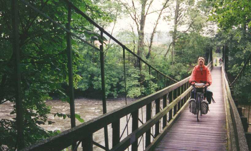 Donderdag 2 juli (Oberteuringen - Lustenau (A), 70 km) We dachten met een overnachting in een Gasthof verzekerd te zijn van een goede nachtrust. Nou dat is dus mooi tegengevallen. Rond een uur of 4 vannacht is er in de bocht bij het hotel een auto uit de bocht gevlogen en over de kop geslagen. Waarschijnlijk te hard gereden tijdens de regen. Politie, ziekenauto, diverse brandweerwagens en het halve dorp waren paraat onder ons slaapkamerraam! Om 8 uur regent het nog behoorlijk en er is dan ook geen enkele reden om op te staan. Om 9 uur zijn we er toch maar uitgegaan. Het is ondertussen droog geworden, maar het ziet er grijs en grauw uit. Na een stevig ontbijt gaan we om half 11 toch maar op pad voor de laatste etappe van deel 1 tot Bregenz. Houten hangbrug bij Laimnau