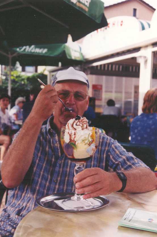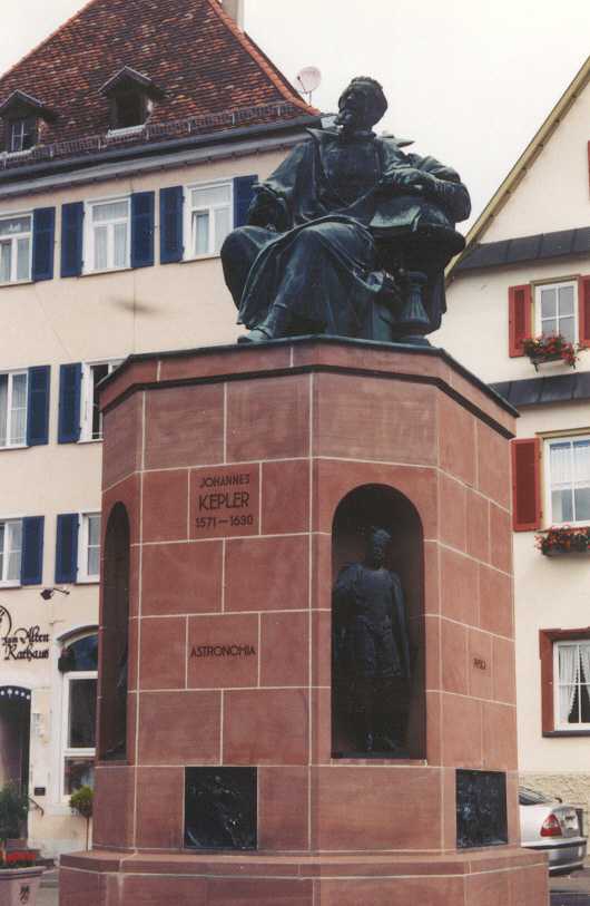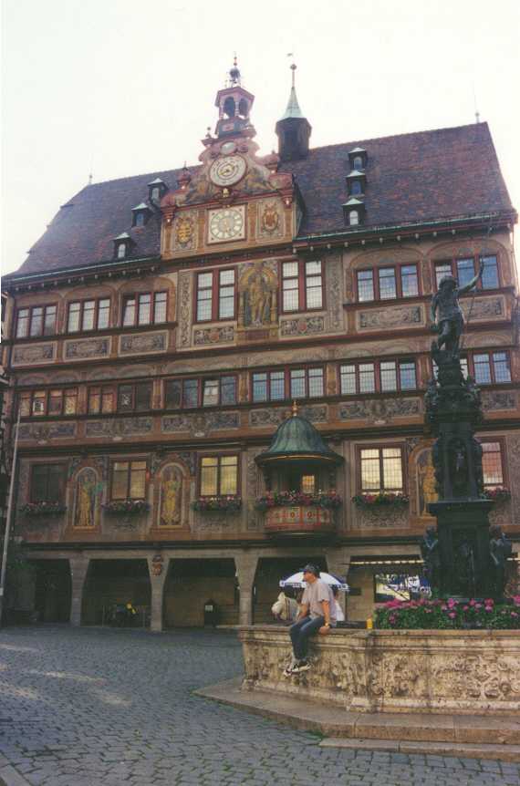 op pad gaan dan de bedoeling is, De route voert ons o.m. langs een prachtig slot in Bruchsal naar Porzheim. Van hieruit hebben we gebeld voor een kamer in Hotel Häckermühle langs de Würm, 12 kilometer verderop. Daar hebben we op het terras gedineerd. Allemachtig dure tent, de soep begint bij DM 10. De route was dus nogal golvend en dat betekent niet alleen klimmen maar ook prachtige uitzichten. Langs de Würm is het ook zeer fraai, wel veel vals plat, maar heel bosrijk. Maandag 29 juni (Porzheim/Häckermühle - Tübingen, 60 km) Standbeeld van Johannes Kepler