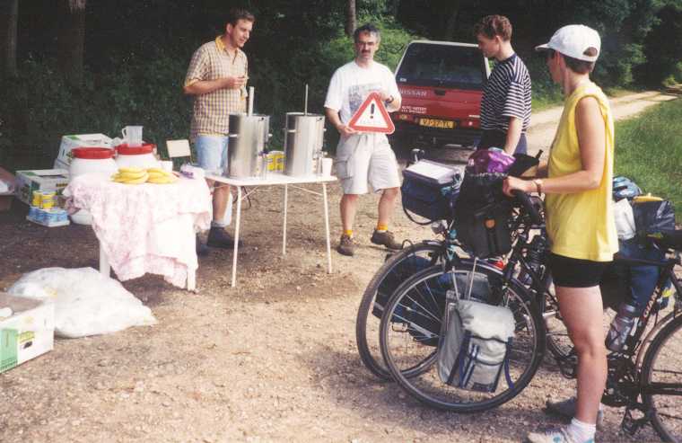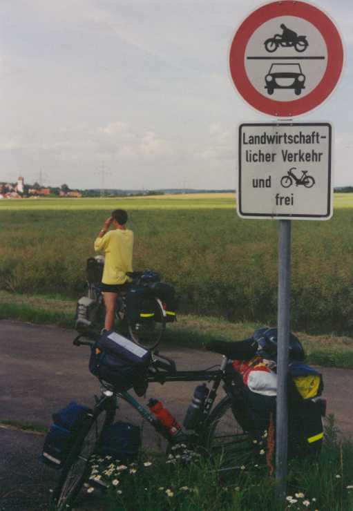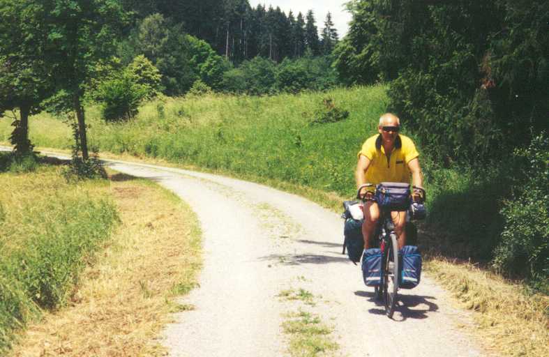 Het eerste stuk valt nog wel mee, maar even na Nehren begint het echt te stijgen. Vanuit Talheim is het 4 kilometer 4-6% moeizaam klimmen, het is duidelijk dat de spieren nog flink getraind moeten worden. In percentages is het nog niet zo veel, maar met ruim 20 kilo bagage is het wel behoorlijk inspannend. De omgeving is werkelijk schitterend. Eerst rijzen de bergen, nou ja bergen, in ieder geval flinke heuvels, nog om je heen op en vervolgens ben je op "gelijke" hoogte. In Melchingen willen we koffie drinken, maar helaas is daar niets te vinden. Bij een bakker kopen we dan maar wat lekkers en een blikje, zodat we op een grasveldje in de schaduw kunnen neerploffen. Hier worden we aangesproken door de oud-burgemeester van het dorp. Hij heeft hele verhalen hoe mooi het dorp en de omgeving is, en nadat hij is vertrokken, komt hij even later weer terug met een paar rozen voor Jos. Volgens hem zou dat geluk brengen. Helaas zijn de kilometers er niet lichter door geworden. Tegen half 5 arriveren we op camping "Kreisstadt" in Sigmaringen. Wederom een prima camping met uitstekend sanitair. De camping ligt direct aan de Donau, anderhalve kilometer van de route af. We hebben op het terras een biertje gepakt en gegeten. Woensdag 1 juli (Sigmaringen- Oberteuringen, 63 km)