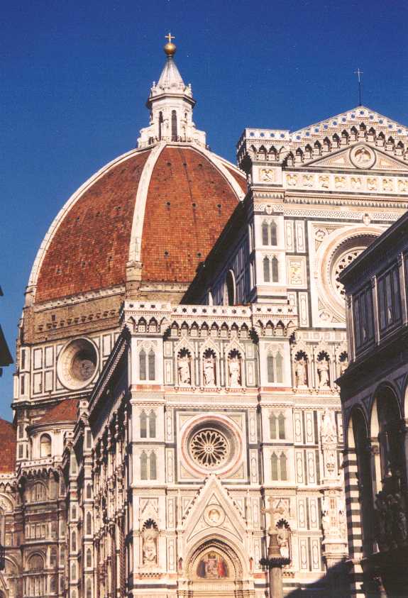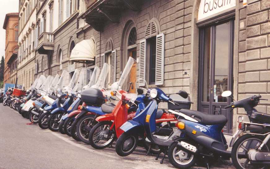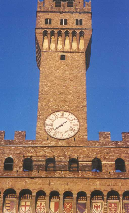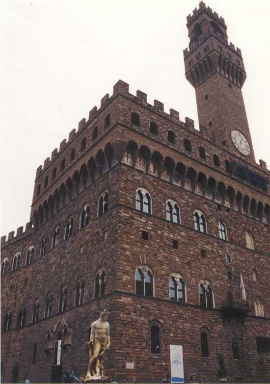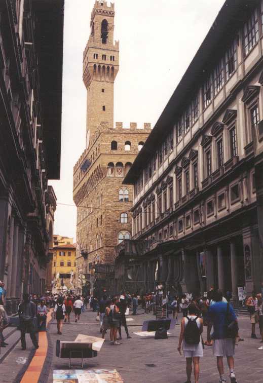 Siena is een hele leuke stad (60.000 inwoners), veel minder kolossaal en druk dan Florence (met ruim 400.000 inwoners). Een heel fraai plein Piazza del Campo (waar de beroemde paardenraces (palio) worden gehouden) en een fraaie Dom van wit en zwart marmer met van binnen veel meer kleuren dan de Dom in Florence. In een zijbeuk is een museum gevestigd met veel beeldhouwwerk van Giovanni da Pisano en met als pronkstuk het fresco ́ 'Maesta' van Simone Martini uit 1315. Siena zelf ligt op 3 heuvels en dat betekent dat de straatjes veel minder recht toe recht aan zijn dan in Florence, ook de kleuren zijn anders. Om half 5 zijn we weer terug in Florence. Daar lekker op een terrasje gezeten op de Piazza della Republica (biertje ƒ 8,-). Later op het Piazza della Signoria ons galgenmaal gegeten bij Il David. Op het terras hebben we nog gezellig met een Duitse vrouw (musicus) zitten praten, die alleen op vakantie is en het bezoek aan Florence combineert met een cursus Italiaans. Zondag 19 juli (Firenze, 8 km) Vandaag is de dag van de terugreis. We hebben daarvoor in Nederland al plaatsen gereserveerd in de slaaptrein van Florence naar München; kaartjes voor de fietsen konden pas hier kopen. Omdat we pas vanavond met de trein vertrekken hebben we uitgebreid de tijd om nog wat van Florence en het mooie weer te genieten. Het wonderlijke is dat we beiden vandaag bekenden zijn tegen gekomen: Jos een oud-collega en ik een collega die hier beiden voor een (hetzelfde) congres zijn. Aan het eind van de middag hebben we weer bij Il