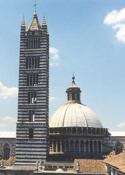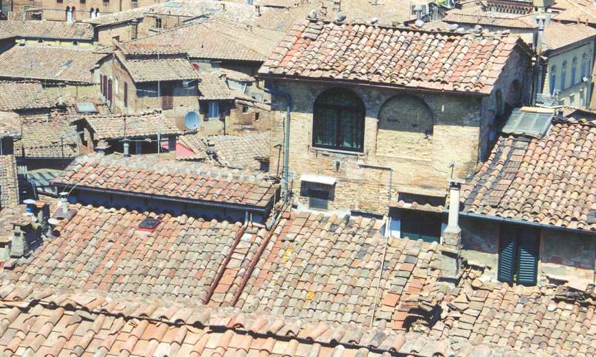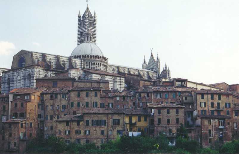 Elk gebouw in het oude stadsdeel van Florence is een plaatje op zich. Elk gebouw heeft iets bijzonders. Na nog wat rondgeslenterd te hebben, zoeken we een terrasje op de Piazza della Republica op om een krantje te lezen en de onvermijdelijke ansichtkaarten te schrijven. Tenslotte gaan we nog naar het busstation en het station om te informeren hoe we eventueel in San Gimignano of Siena kunnen komen. Of we dit echt gaan doen weten we nog niet. Uiteindelijk hebben we in de stad bij een self-service restaurant wat gegeten. Morgen hebben we onze afscheidsavond en dan gaan we nog een keer echt uit eten. Zaterdag 18 juli (Firenze, Siena, 13,5 km) We hebben besloten om vandaag Siena te bezoeken. Dat betekent bijtijds opstaan, op de fiets naar het busstation, fiets in een soort openbare fietsenstalling plaatsen en dan enkeltjes kopen om daar retour mee te reizen! (was niet de bedoeling). De busreis naar Siena duurt ongeveer 1½ uur.