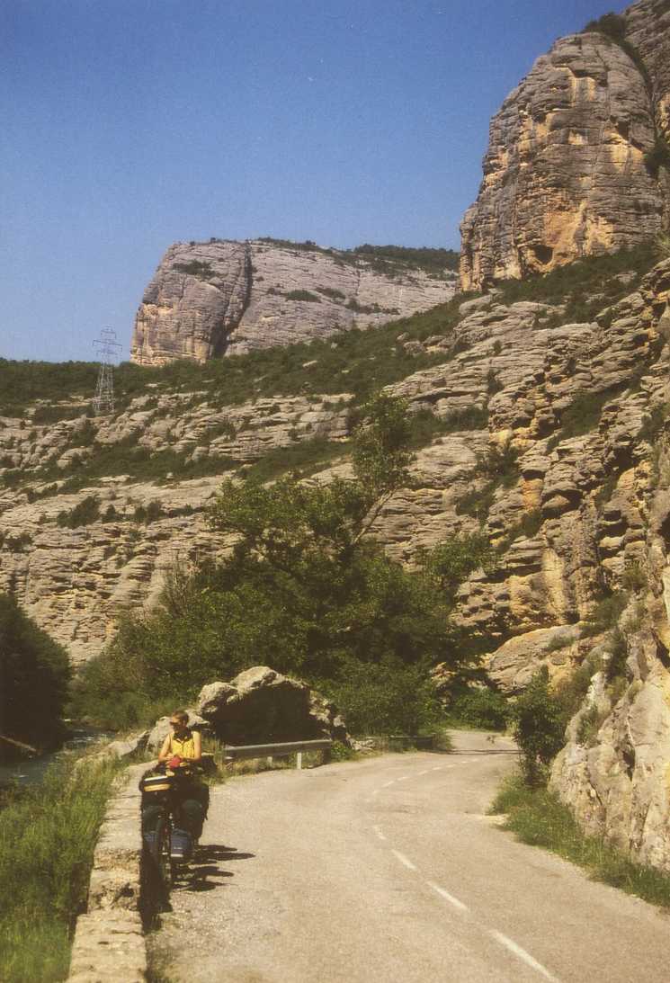 Na de eerste nacht kamperen vergt het bij ons altijd nogal wat tijd voordat we op pad kunnen. We vertrekken dan ook pas om half 11 onder een strak blauwe hemel. We moeten ook nog op zoek naar campinggas, een goede fietskaart van de Pyreneeën (Firestone 443) en batterijen voor het fototoestel. We komen dan ook maar moeilijk op gang en uiteindelijk maken we de meeste kilometers op het heetst van de dag. Nadat we de Frans - Spaanse grens zijn gepasseerd, rijden we ook nog een tijdlang op een drukke weg, dus kun je wel spreken van een niet zo'n geslaagde dag. Pas laat in de middag komen we op de voor ons pas echt interessante "witte" weggetjes terecht. En gelijk is het weer heerlijk rustig. Om 6 uur komen we moe en bezweet aan op de mooie camping van Esponella. Het is hier nog heerlijk rustig, er staan wel een aantal Nederlanders, maar de vaste Spaanse campinggasten komen nu alleen nog maar in het weekend. De volgende dag is het vrijwel meteen klimmen geblazen. Na een uurtje begint het te regenen en doen we zelfs het regenjack aan. Gisteren zaten we nog te puffen van de hitte. Dit zijn dus de Pyreneeën. Het kan verkeren.