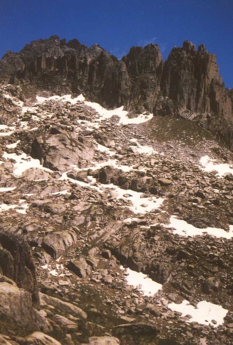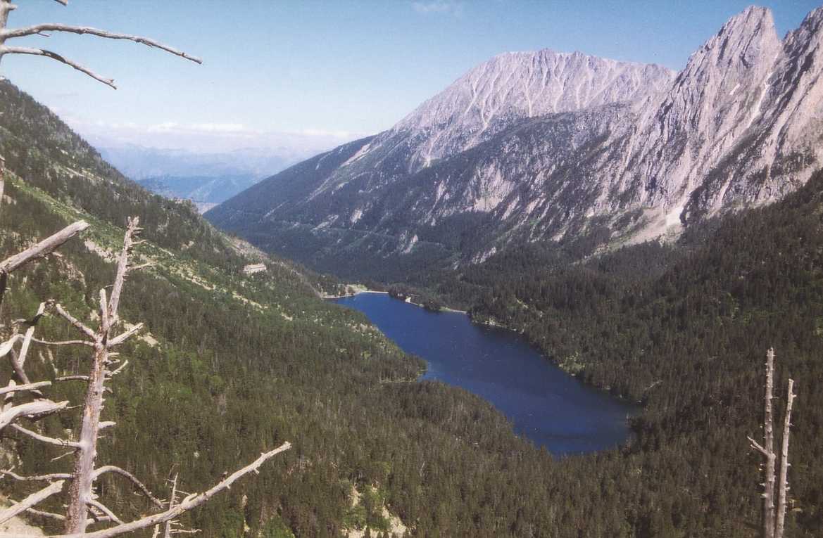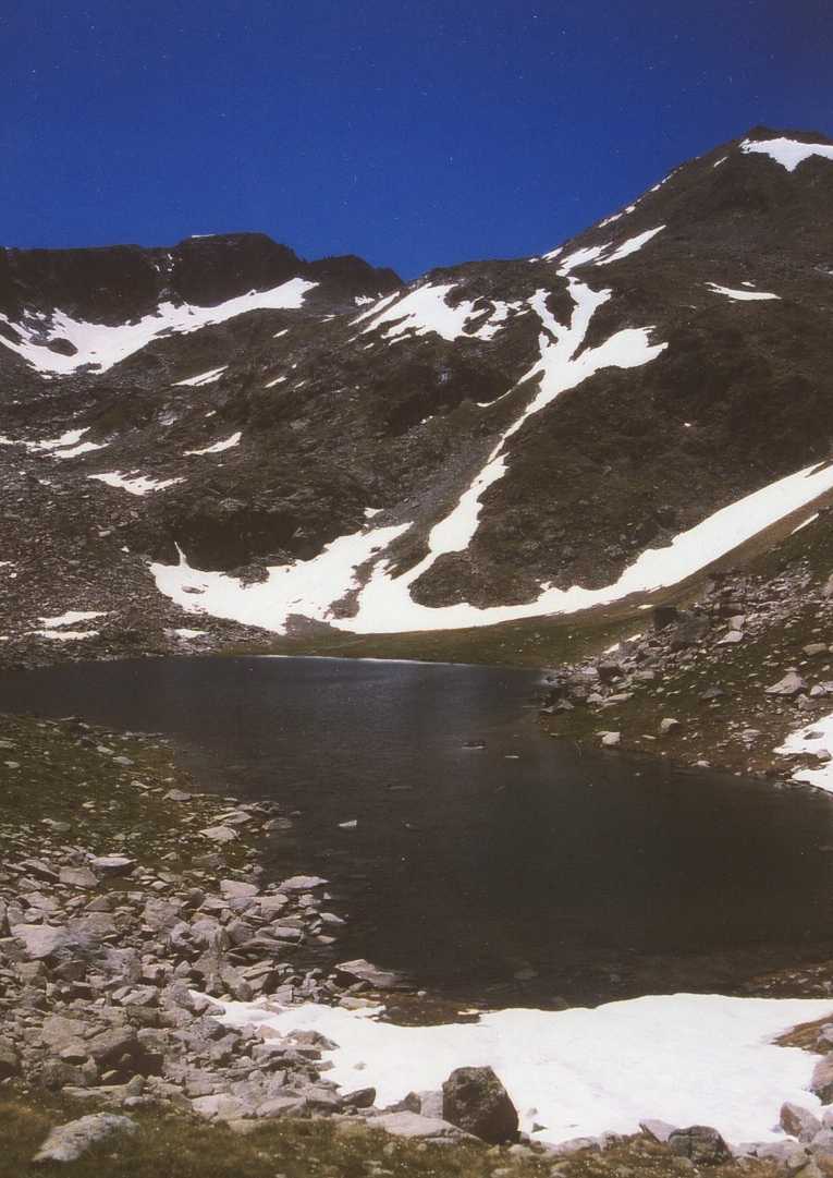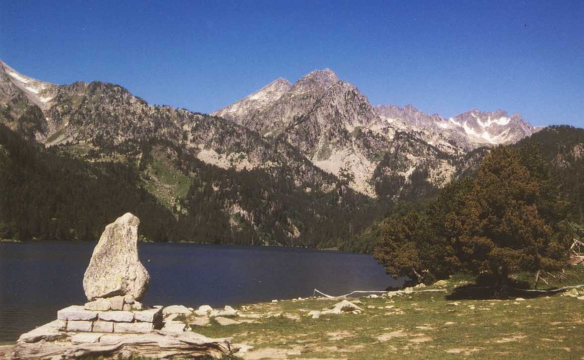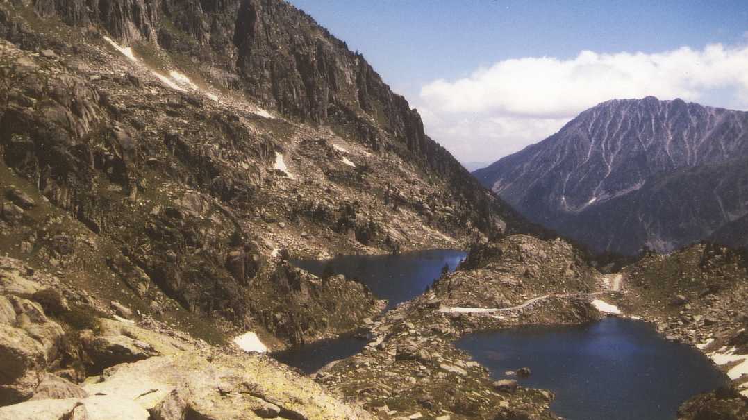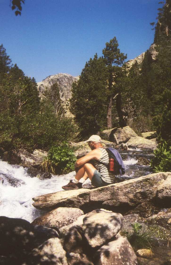 Zodra het weer droog is zwermt iedereen uit en starten wij onze wandeling rondom het meer. Wat is het hier gigantisch mooi. Het meer is diepgroen en wordt omgeven door gigantische bergen. De rest van de middag is het vrijwel steeds droog en kunnen we nog heerlijk van de zon genieten. Nadat we om het meer heen zijn gelopen, gaan we via de GR11 terug naar Espot. Het is weer prachtig om tussen de bergen te zijn. We zijn omstreeks 6 uur terug in het dorp, waar we nog een cola en Fanta naranja drinken. Daarna onder de douche, scheren, enz. en weer terug naar het dorp om te gaan eten: er is n.l. een restaurantje waar je "al" om half acht kunt eten (negen uur is hier normaal). ’s Nachts onweert het vrijwel continue en regent het gigantisch, maar ons tentje (Birdland Ellips 390) is er tegen bestand. De volgende morgen ziet het er nog steeds niet zo best uit, maar tegen elven begint het toch weer wat op te klaren. Na eerst nog een bakkie in het dorp, gaan we tegen twaalven dan toch maar op pad. We besluiten een stukje van de route naar Estany Negre via de Refugi J.M. Blanc te lopen. Het is een prachtige maar zware wandeling met zeer steile stukken. Desalniettemin komen we om half 3 boven bij het meer. De natuur is weer onbeschrijfelijk mooi; gigantische kale rotsen om je heen. Het is dus volop genieten geblazen. De terugweg is heel zwaar, vooral voor je knieën. Het laatste stuk is dan ook niet meer echt leuk. Je loopt dan vooral door bos en hebt geen uitzichten meer. Om 6 uur zijn we weer terug in het dorp voor wat drinken en een ijsje.