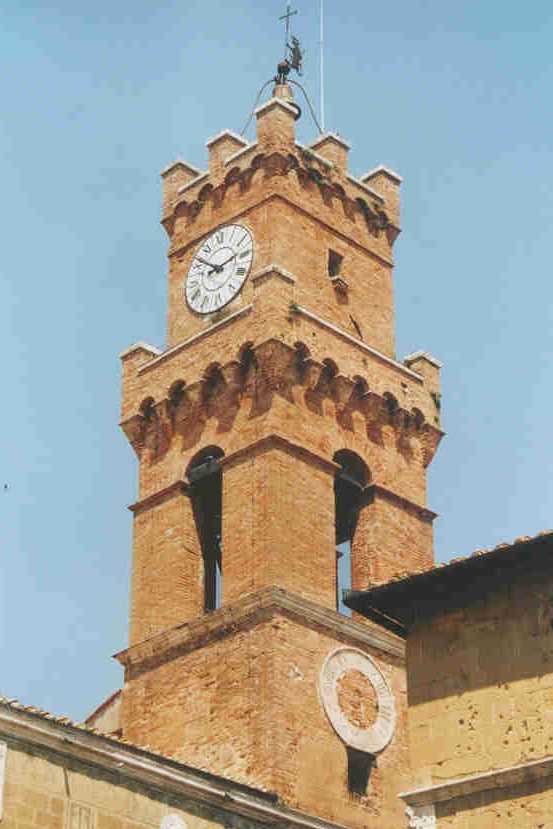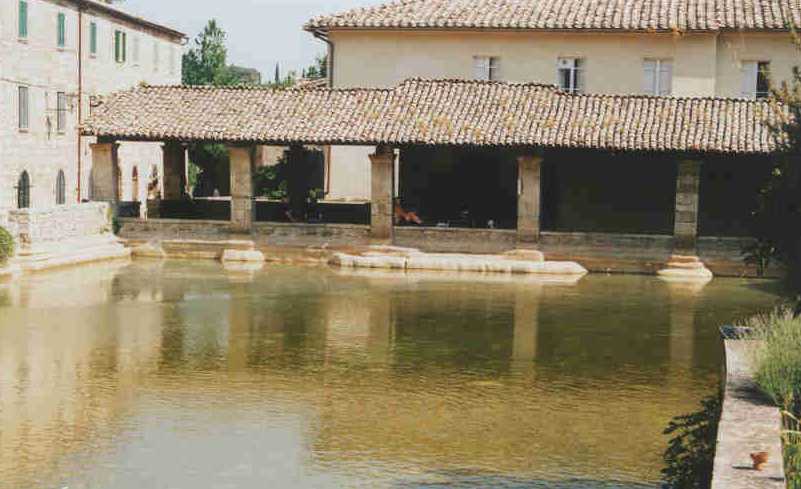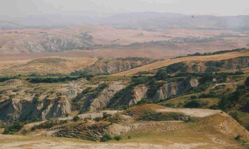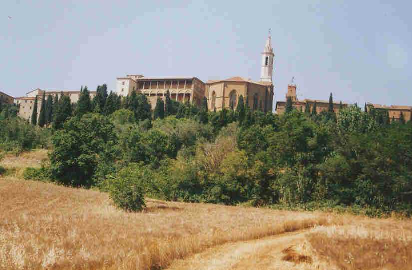 De volgende dag richting Pienza komen we in de zogeheten Le Crete, een vreemd landschap met lage leemheuvels die door erosie helemmal kaal zijn. Heel bijzonder. We stoppen met het oog op de hitte al vroeg (na 35 km) in San Quirico d'Orcia en nemen onze intrek in Il Garibaldi, een soort pension. En na een frisse douche en de lunch gaan we zonder bagage weer op pad. Eerst naar Pienza, een prachtige stad met veel middeleeuwse gebouwen, en fraaie kleine straatjes. Omdat Pienza heel hoog ligt t.o.v. de omgeving, is de afdaling richting Spedaleto spetterend. We fietsen door naar Bagno Vignoni. In plaats van een dorpsplein is hier een warmwaterbron midden in het dorp, een groot bassin van 50 x 30 meter. Heel apart. Daarna dalen we weer af naar San Quirico.