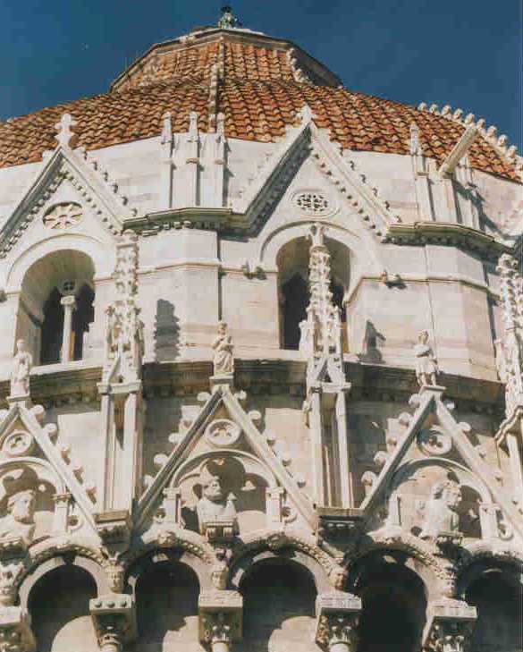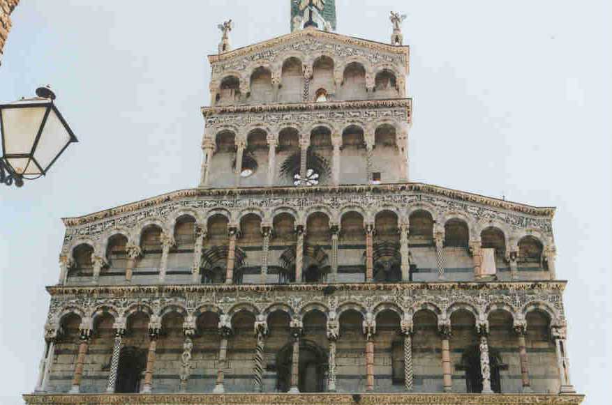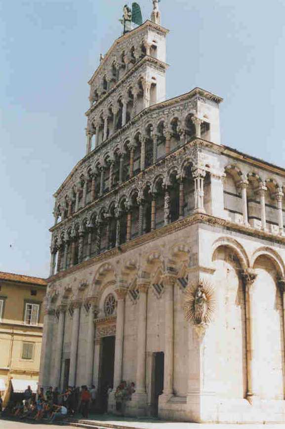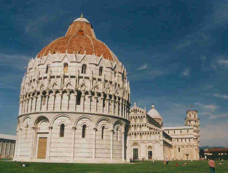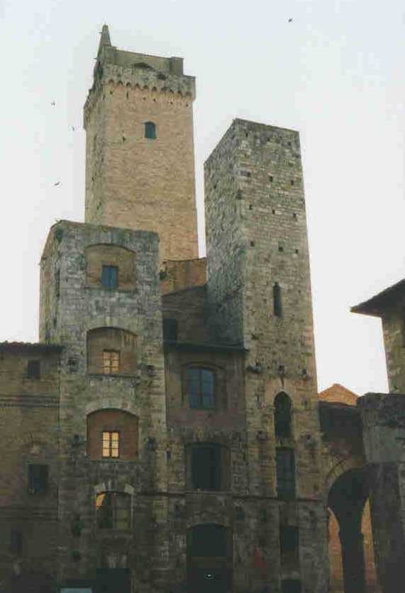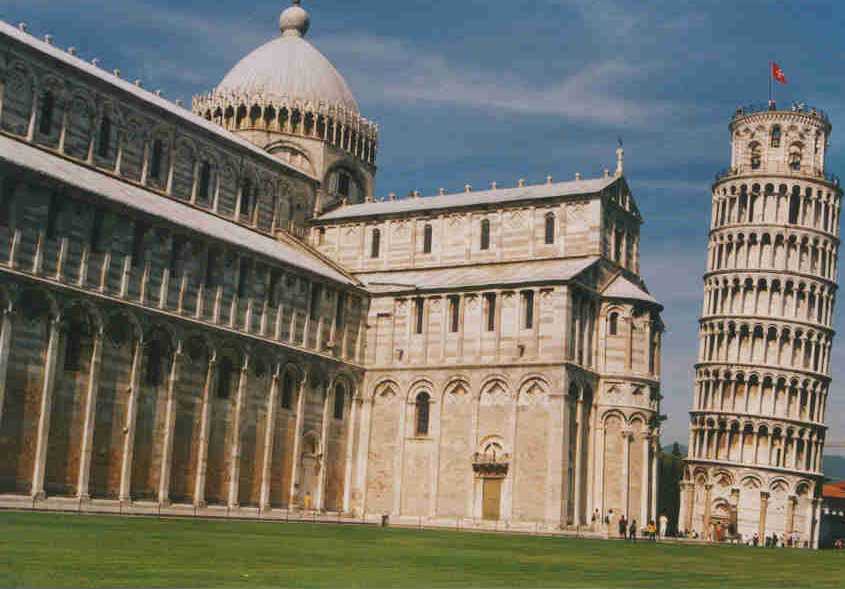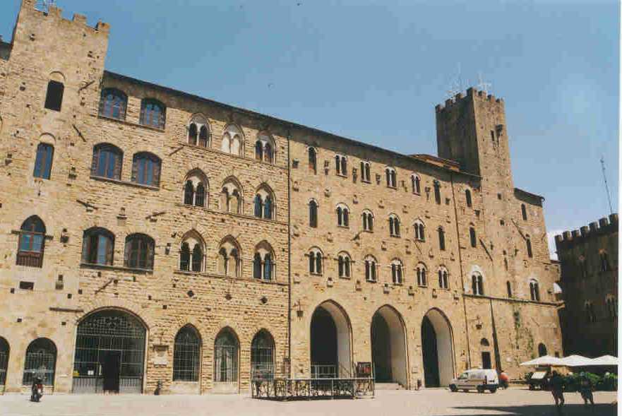 hetzelfde terras zullen zitten 's Avonds bekijken we San Gimignano, er zijn inderdaad veel torens, maar wij vinden het op een afstand veel mooier, dan binnen de stadsmuren. Het door Luc Otreman aanbevolen restaurant 'Enoteca Il Castello' blijkt een eetfabriek te zijn, onvriendelijk personeel, het eten stelt niet veel voor en of je maar op wilt schieten, want de volgende gasten staan te wachten... De volgende dag bezoeken we, op weg naar Nicolino, oa. Volterra, een prachtige stad (uiteraard strategisch, dus hoog gelegen, zoals alle steden die we in deze vakantie bezoeken) met schitterende gebouwen op het Piazza dei Priori, zoals het 13e eeuwse Pallazzo dei Priori (zie foto) en het Palazzo Pretorio met een fraaie toren. Na een bezoek aan zo'n hooggelegen stad is het natuurlijk weer heerlijk afdalen. We besluiten niet door te rijden tot aan Cecina (dat aan zee ligt), zoals de routebeschrijving aangeeft. We proberen op deze manier de drukte te ontlopen. We gaan een kilometer of 8 voor Cecina in noordelijke richting naar Ripperbella. We vinden enkele kilometers voorbij Riperbella, na weer stevig geklommen te hebben, een leuk familiehotel in Nicolino. De volgende dag gaan we op pad naar Pisa en dat betekent dat we het laatste stuk door een vrijwel vlak landschap rijden. Pisa zelf is natuurlijk erg toeristisch, maar dat weet je als je er naar toe gaat. In Pisa draait alles om het Campo dei Miracoli, waar de Torre Pendente inderdaad wel erg scheef staat, maar waar op het groene gras ook een prachtige witte Duomo en Baptisterium staan. Het toeristisch gebeuren, de stalletjes met souvenirs, staan gelukkig niet in het blikveld op al dit fraais.