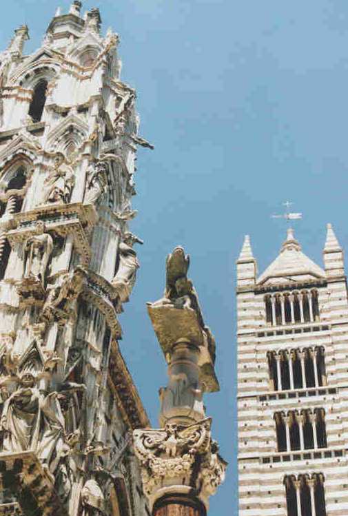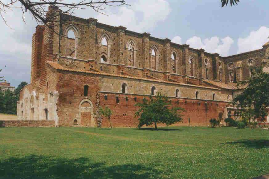 Museo Civico mag je helaas niet fotograferen. Het centrum van Siena, met Duomo, Campanile en Palio; rechtsonder de ruïne van San Galgano.