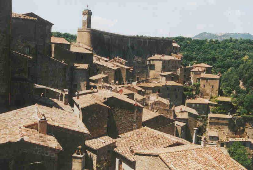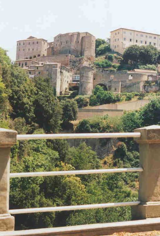 Vanwege hitte ook vandaag weer een korte etappe, 36 km naar Castel del Piano. Hier heb ik wat problemen met de campingeigenaar, omdat ik, om op de camping te mogen rondkijken, mijn paspoort moet inleveren. En dat weiger ik. Maar hij is onverbiddelijk, de volgende camping is een eind verderop, en het is warm... Gelukkig blijkt het een hele prettige camping te zijn, met de eigenaar heb ik later ook weer vrede gesloten. Vandaag (maandag 24 juni) gaan we op pad naar het Lago di Bolsena, waar we een paar echte rustdagen aan het meer willen doorbrengen. De route voert ons door een prachtige omgeving, via een klim naar Selvia en daarna door Sorano, dat werkelijk prachtig is gelegen in en op de rotsen.