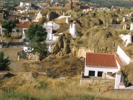 rijdt hij met een vracht We vervolgen onze weg over de NE50, NE43 en A326 en komen tussen Pedro Martines en Fonelas door een soort duinlandschap, heel apart. In Benalúa de Guadix, waar we lunchen, zien we voor het eerst de sneeuw van de Sierra Nevada. We rijden verder via Purullena naar Guadix. Het is hier weer bloedheet, maar we kunnen toch de moed opbrengen om naar de wijk te rijden (=klimmen) waar 2000 grotwoningen zijn. Dit is niet iets toeristisch, maar praktische werkelijkheid: 15% van de bevolking van Guadix woont in dit soort huizen: altijd dezelfde temperatuur, ook nu het hier buiten boven de 40 graden is, is het binnen nog geen 20. Naar ons idee is het wel een arme wijk en wonen hier vooral veel mensen uit Noord Afrika. In Guadix staat ook een mooie kathedraal met stoelen van fraai houtsnijwerk.
