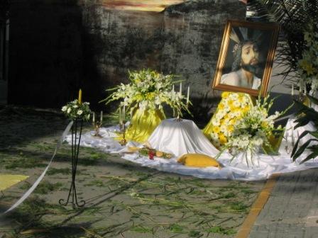 Om acht uur zitten we de volgende dag (zondag 22 juni) op de fiets om aan het traject naar Huelma te beginnen (etappe 25 van LO in omgekeerde richting). Het eerste stuk tot Peal de Becerro hebben we een aantal dagen geleden al in omgekeerde richting gereden toen we op weg waren naar Cazorla. We merken nu dat we toen heel wat hebben geklommen, want de eerste 25 km is nu bijna alleen maar dalen. Ook nu stoppen we weer in Peal. Er lijkt een processie op komst, de straat ligt bezaaid met graanhalmen en overal staan Mariabeelden en foto’s van Jezus. Maar er zit geen schot in de zaak, dus besluiten we niet langer te wachten en door te fietsen tot Jódar voor de koffie. Halverwege missen we blijkbaar een afslag, want we fietsen uiteindelijk via de A301 Jódar binnen, i.p.v. de A322. Op een plein midden in het dorp staan een aantal kroegen. Heel opmerkelijk is dat bij en in al die kroegen alleen maar mannen rondhangen; zondagochtend gewoonte?