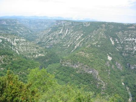 gebied bevinden, want hier zijn alle winkels gewoon open. We rijden vandaag door het Parc Régional des Grands Causses. Vanaf La Besse hebben we naar Broquiès een heerlijke afdaling van 10 kilometer lang; we zijn afgedaald van 728 naar 266 meter, en komen bij een brug over de Tarn uit. Hierna volgen we geruime de Tarn, en wat later fietsen we langs de Dourdou. Het weer ziet er dreigend uit, maar we kunnen nog net St. Affrique halen, zonder nat te worden. Hier lopen we weer eens een Plat du Jour op. Na de lunch is het weer droog en fietsen we over de D7 langs de rivier de Sorgues. Aangezien we stroomopwaarts rijden, is dit licht vals plat. Dit blijft zo tot vlak voor Cornus, waar we nog een stukje flink moeten klimmen. In Cornus gaan we op zoek naar de beloofde camping. Maar alles wat we kunnen vinden: geen camping. Zou er nog een andere plaats bestaan met dezelfde naam? We besluiten uiteindelijk dan maar om een kamer te nemen in het enige hotel dat er in Cornus is: Hotel du Nord. Cornus stelt weinig voor, gelukkig dat we tussen de middag al een warme lunch hebben gehad, zodat we op de hotelkamer van een koud diner (brood dus) kunnen genieten. De volgende ochtend gaan we richting La Couvertoirade, maar vlak voordat we La Couvertoirade binnenrijden hebben we nog een vreemde ervaring. Nadat we een snelweg zijn overgestoken, verandert het landschap van het ene moment op het andere. Eerst rijden we nog door het gebruikelijke heuvellandschap van Zuid-Frankrijk, maar nadat we de weg zijn overgestoken lijkt het net of we aan de voet van de Pyreneeën fietsen, maar die zijn hier toch nog wel een heel eind vandaan. We zijn benieuwd of La Couvertoirade aan de verwachtingen voldoet die door de campingbaas in Villefranche zijn gewekt: de ook door hem genoemde camping hebben we immers nooit kunnen vinden. Maar wat La Couvertoirade betreft heeft hij groot gelijk: het is een juweeltje!