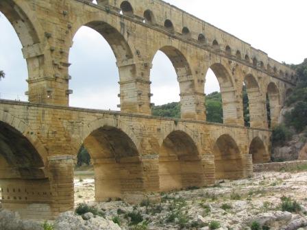 Anduze is overigens wel erg toeristisch. We vervolgen onze weg over de D982, dat zijn makkelijke, maar ook drukke kilometers. Uiteindelijk komen we door het dal van de Gardon (=Gard) te fietsen. Het is hier erg droog, er zijn veel wijngaarden, en de natuur is veel minder mooi dan de afgelopen dagen. Ook de wind is ons niet goed gezind. We komen aan het eind van de middag dan ook wat uitgewoond aan in Collias. We zijn direct doorgereden naar de camping La Barrelet. En dat valt nogal tegen. Het is een driesterren camping, maar erg groot en druk, en er is veel publiek dat hele andere opvattingen heeft over vakantie houden dan wij. Het kost bovendien nogal wat moeite om de tent op te zetten: harde ondergrond, het is heet, en het waait erg hard. En als er dan ook nog een tentstok breekt, is kamperen even helemaal niet leuk meer. Maar het voordeel van zo’n camping is wel dat je voor een pilsje en het warme eten niet meer op stap hoeft: de bar en het restaurant voldoen aan al onze behoeftes. ’s Avonds laat is er een spectaculair onweer, we zien aan één stuk door lichtflitsen tussen twee wolkenlagen in, maar we horen het geluid van de donder niet. We hadden gepland om hier eventueel een rustdag te nemen, maar dat stellen we nog een dag uit.
